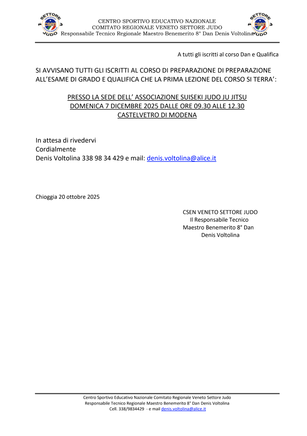 Il Settore Regionale Veneto CSEN – Settore Judo informa tutti gli iscritti che la prima lezione del corso di preparazione agli esami di grado e qualifica si terrà domenica 7 dicembre 2025, dalle ore 9.30 alle 12.30, presso la sede dell’Associazione Suiseki Judo Ju Jitsu a Castelvetro di Modena.